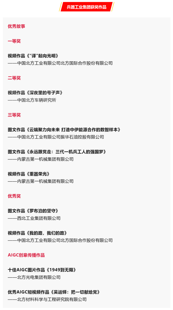 兵器工業(yè)集團9件作品在第七屆中央企業(yè)優(yōu)秀故事暨AIGC創(chuàng)意傳播作品發(fā)布展示活動中獲獎 |